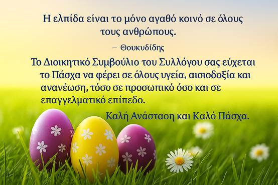 Ευχές από το Δ.Σ. τού συλλόγου για το φετινό Πάσχα.  Δείτε την ευχετήρια κάρτα μας εδώ...